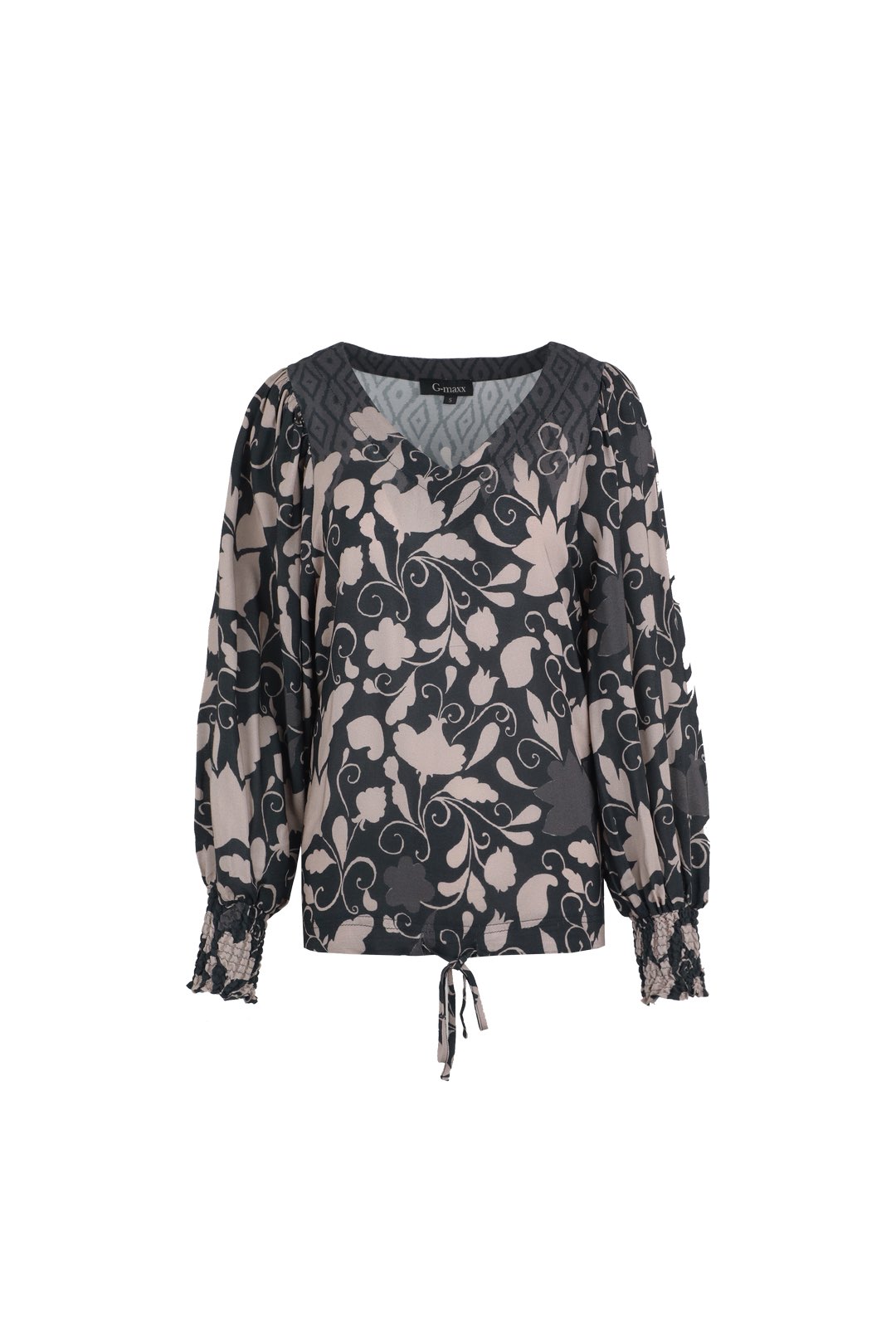 Blouse van G-maxx in een all-over dessin met lange pofmouwen voorzien van brede gesmokte manchetten, V-hals en een trekkoord in de zoom.