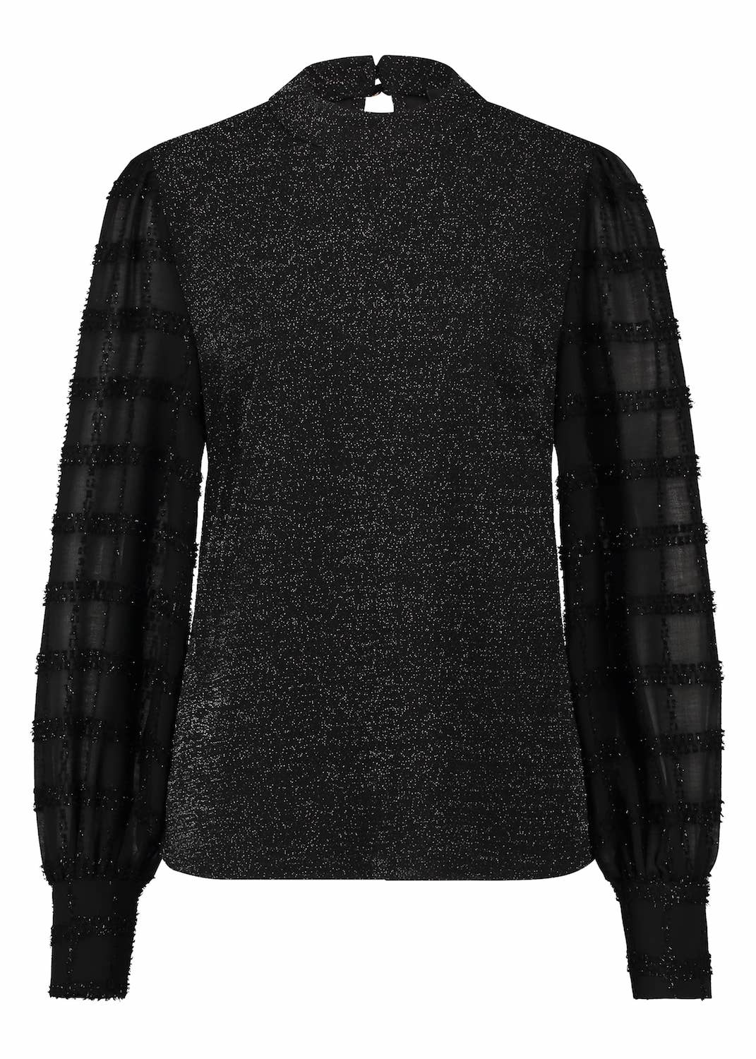 Lurex top van Tramontana met chiffon lange pofmouwen voorzien van structuur dessin en een opstaande kraag voorzien van keyhole met knoopsluiting aan de achterzijde.