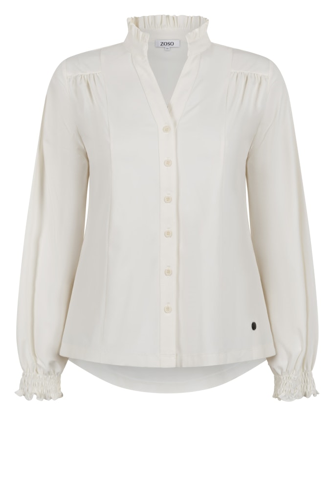 Blouse van ZOSO in travel kwaliteit met lange pofmouwen voorzien van gesmokte manchetten, opstaande kraag met ruches, V-hals, plooidetails en een knoopsluiting. Materiaal: Polyamide 80%| elastan 20%