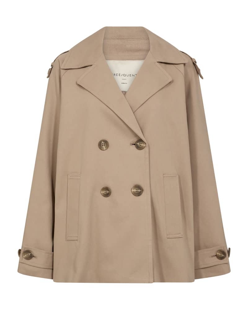 Korte trenchcoat van Frequent met een reverskraag, double-breasted, epauletten op de schouders, steekzakken en een flap aan de achterzijde voorzien van split.