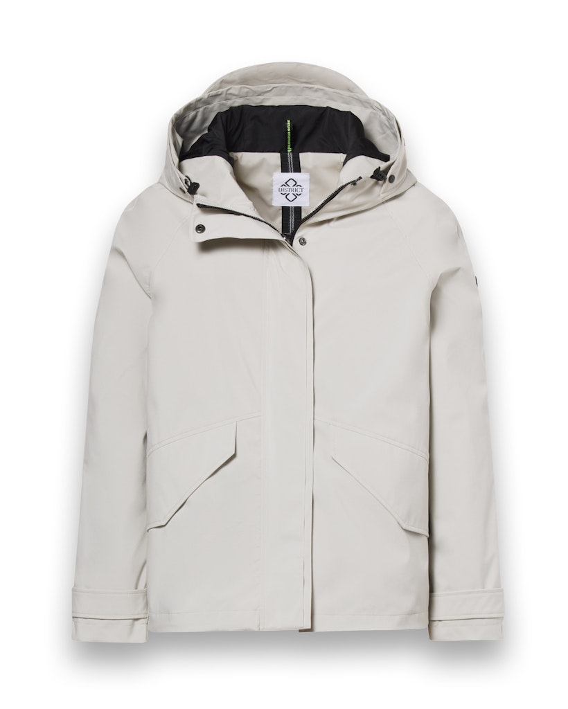 Waterafstotende jas van District met een verborgen drukknoop- en ritssluiting, capuchon voorzien van drawstring, verstelbare manchetten en twee klepzakken.