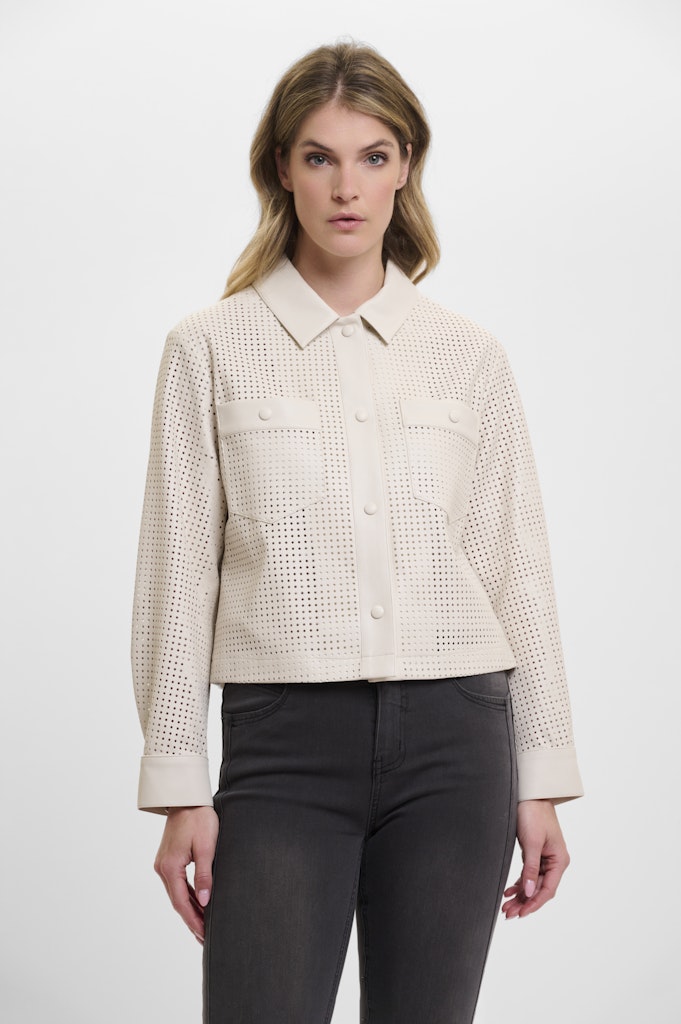 Geperforeerde, gecoate jacket van Rino & Pelle met lange mouwen, kraag, drukknoopsluiting en twee opgestikte borstzakken.