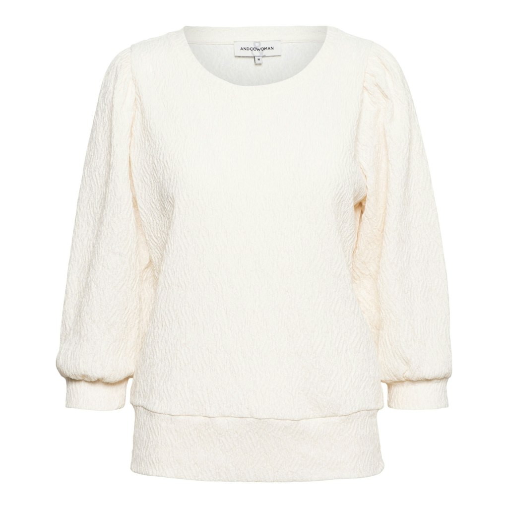 Top van &Co Woman in een structuur dessin met driekwart pofmouwen, ronde hals en elastische boorden.