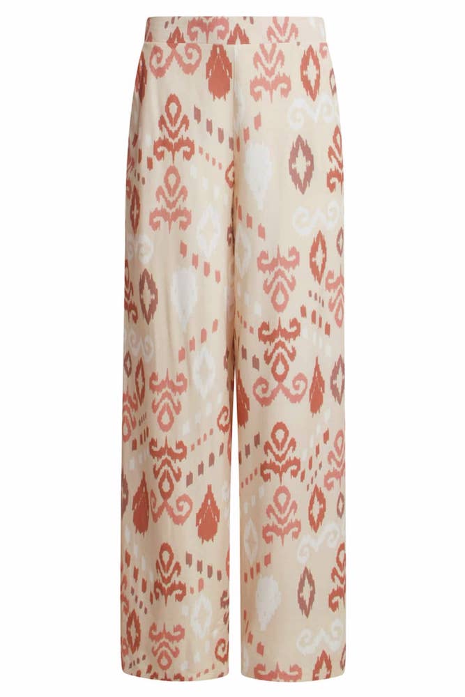 Broek van Smashed Lemon in een aztec print met wijde pijpen, steekzakken en een elastische tailleband. Materiaal: Rayon 100%