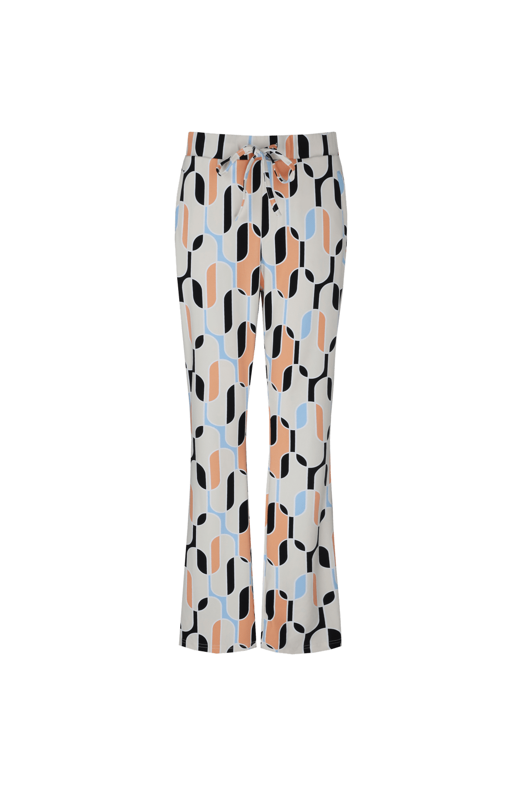 Flared broek van G-maxx in een grafisch dessin met steekzakken, paspelzakken aan de achterzijde en een elastische tailleband voorzien van trekkoord.