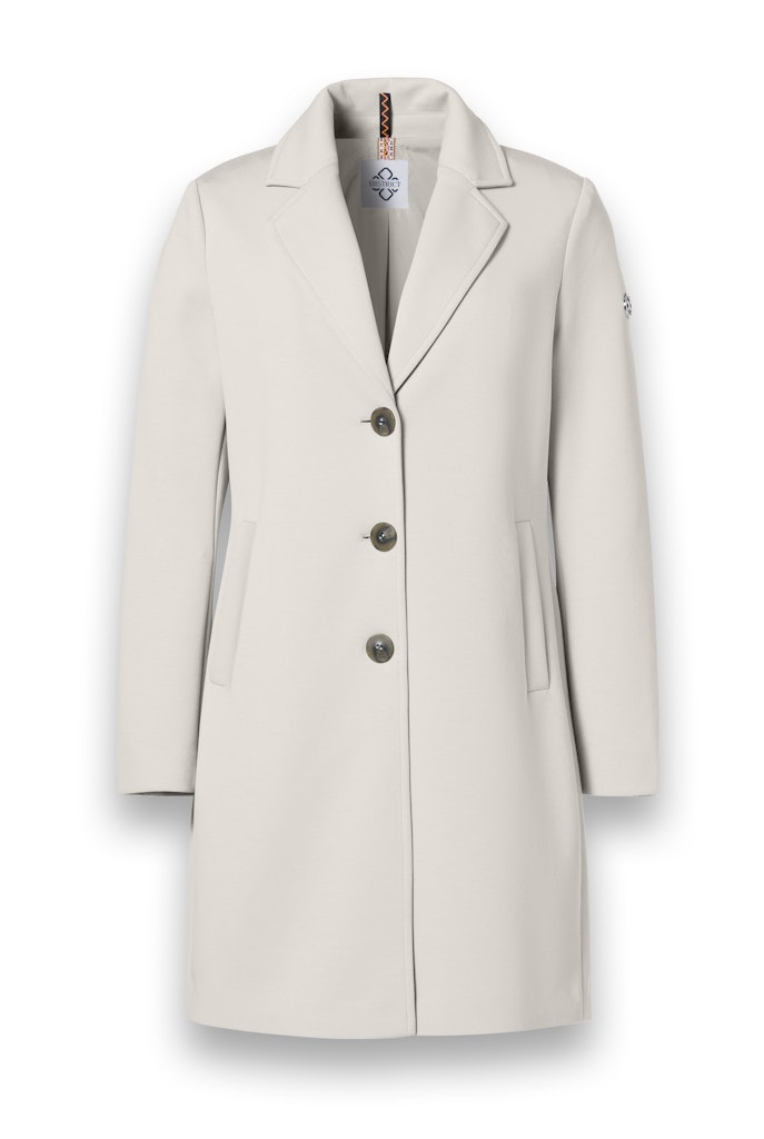 Jas van District met een knoopsluiting, reverskraag en steekzakken. Materiaal: Polyester 52%| katoen 43%| elastan 5%