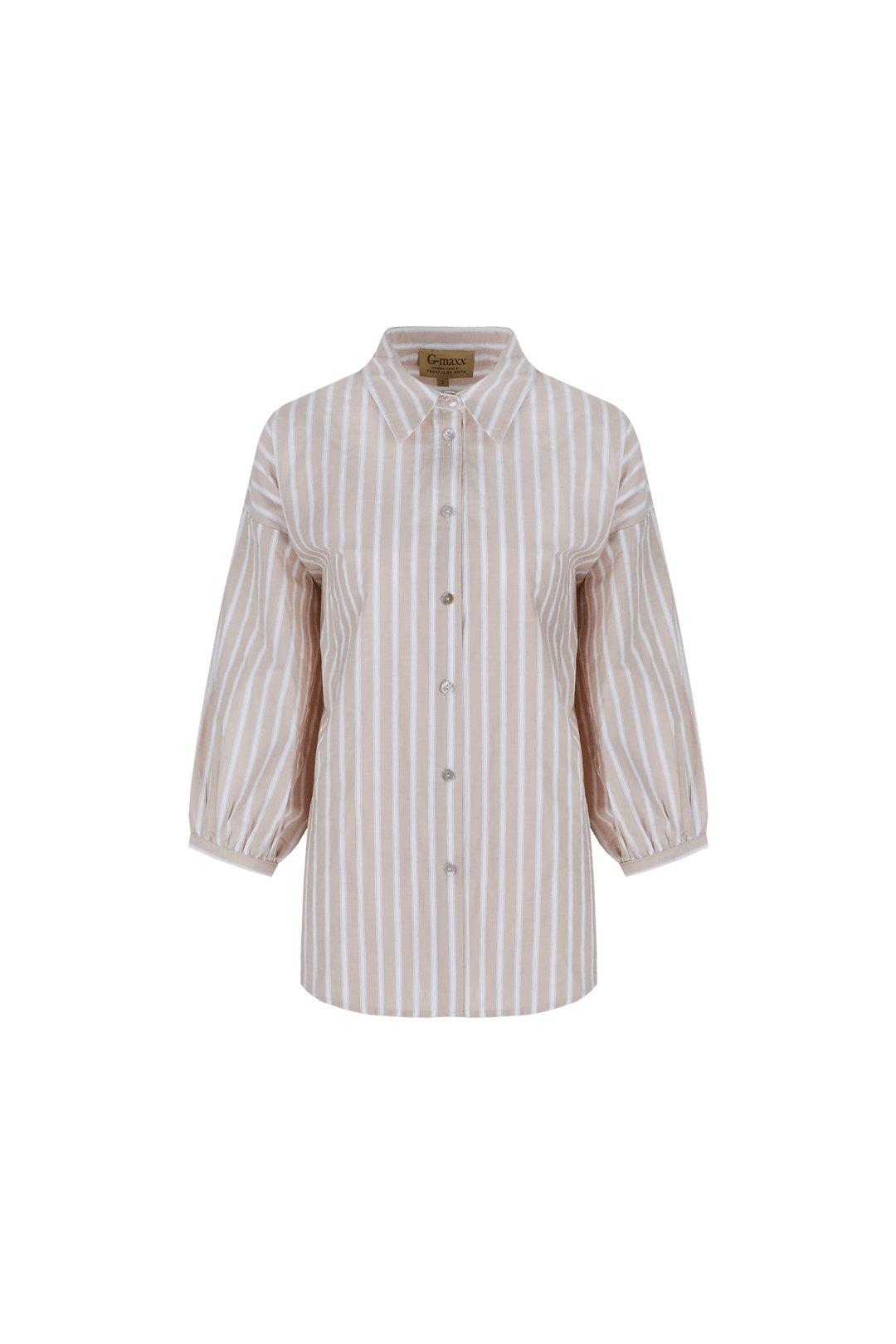 Gestreepte blouse van G-maxx uit de Froukje de Both collectie met driekwart mouwen, verlaagde schoudernaden, knoopsluiting en klassieke kraag.