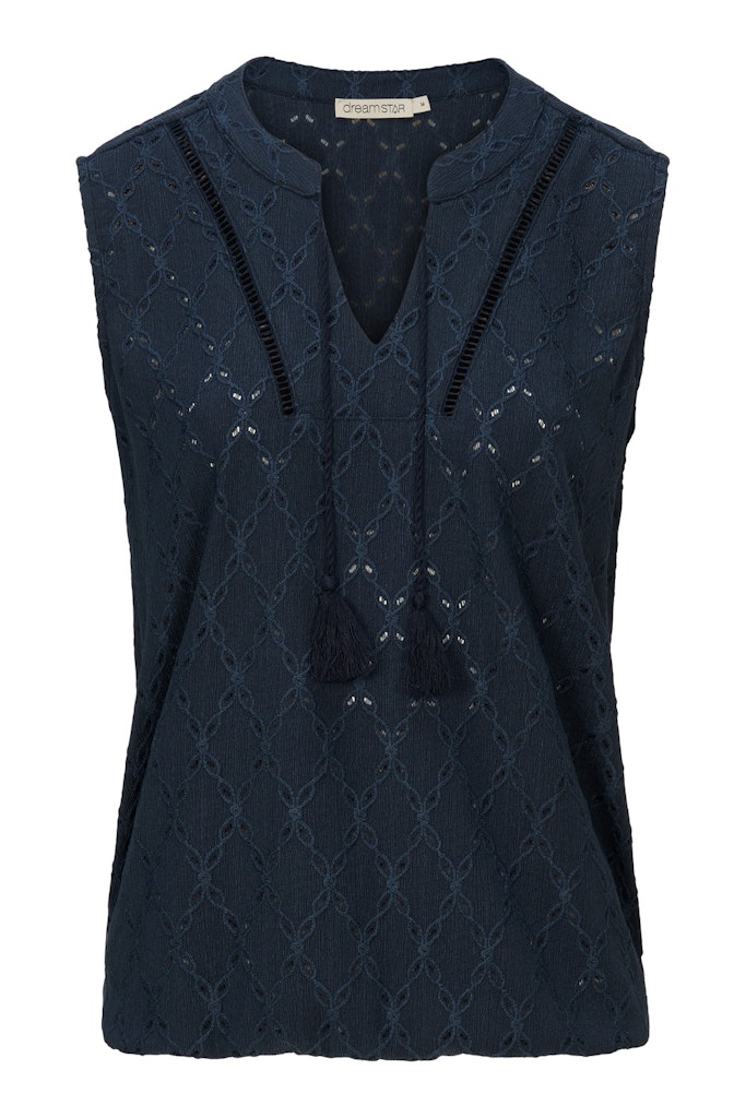 Mouwloze broderie top van Dreamstar met een opstaande kraag, V-hals en een twee sierkoordjes. Materiaal: Polyester 9%| elastan 1%