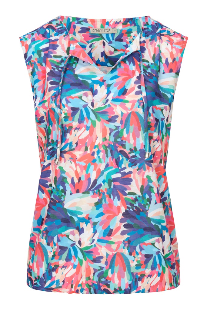 Mouwloze top van Dreamstar in een all-over dessin met V-hals voorzien van sierkoord en een elastische zoom.
