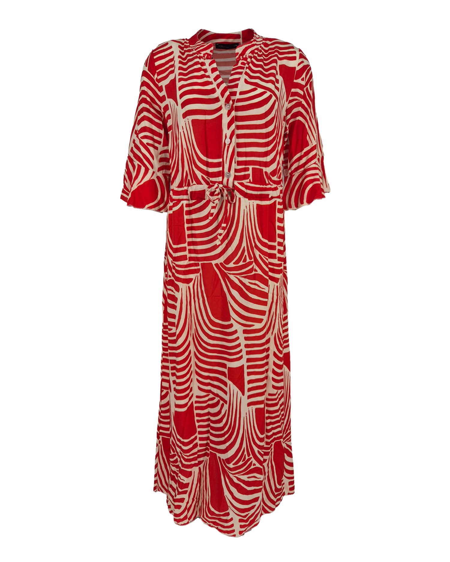 Jurk van FOS Amsterdam in een all-over dessin met halflange mouwen, ronde hals voorzien van V-uitsnede, knoopsluiting tot aan de taille en tunnelkoord in de taille.
