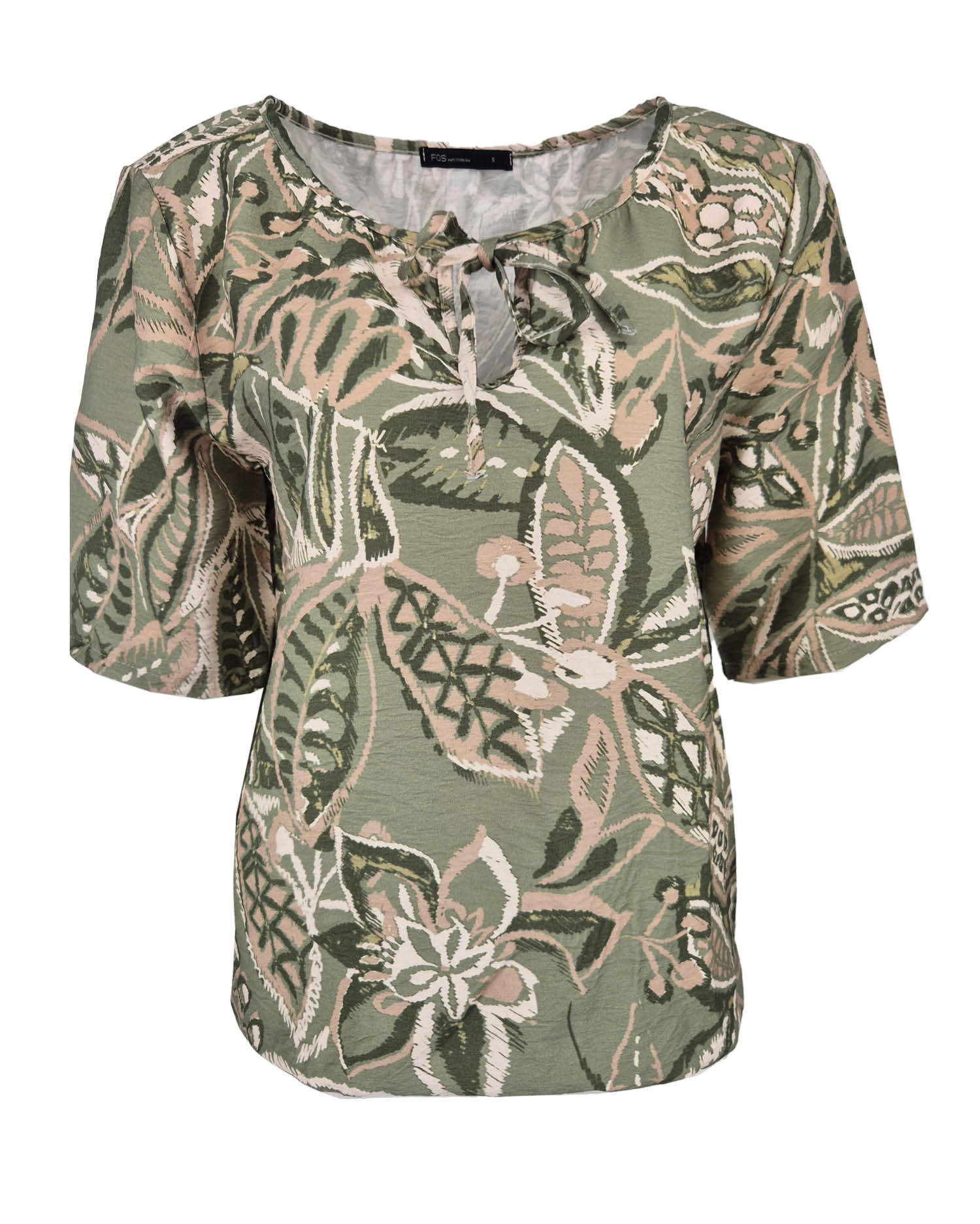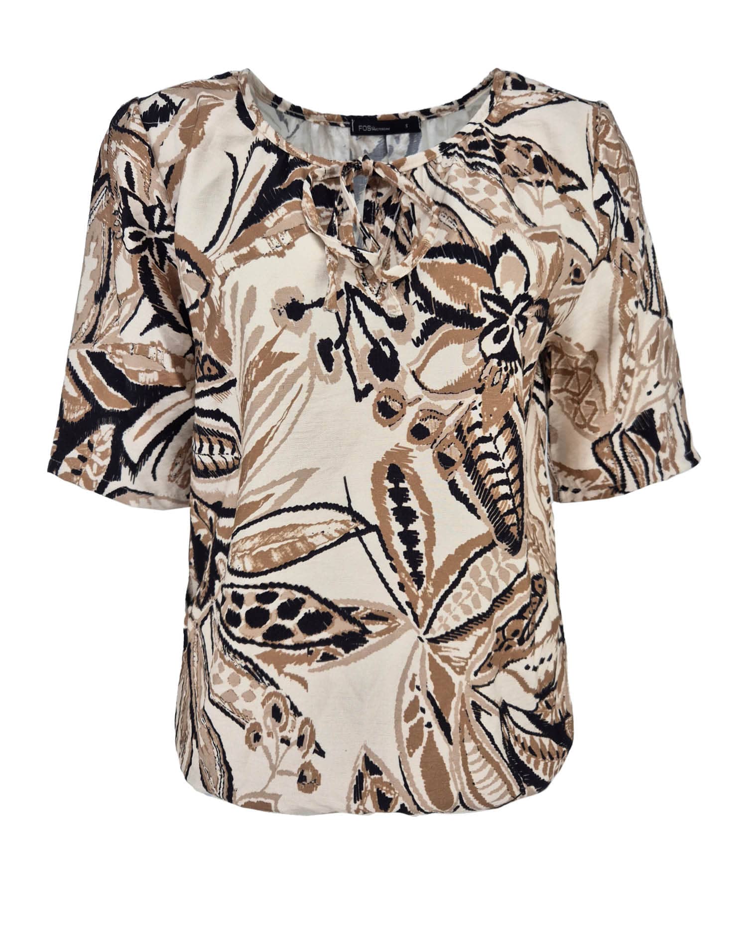 Blouse van FOS in een all-over dessin met korte mouwen, ronde hals voorzien van split en striksluiting en een elastische zoom. Materiaal: Viscose 85%| nyon 15%