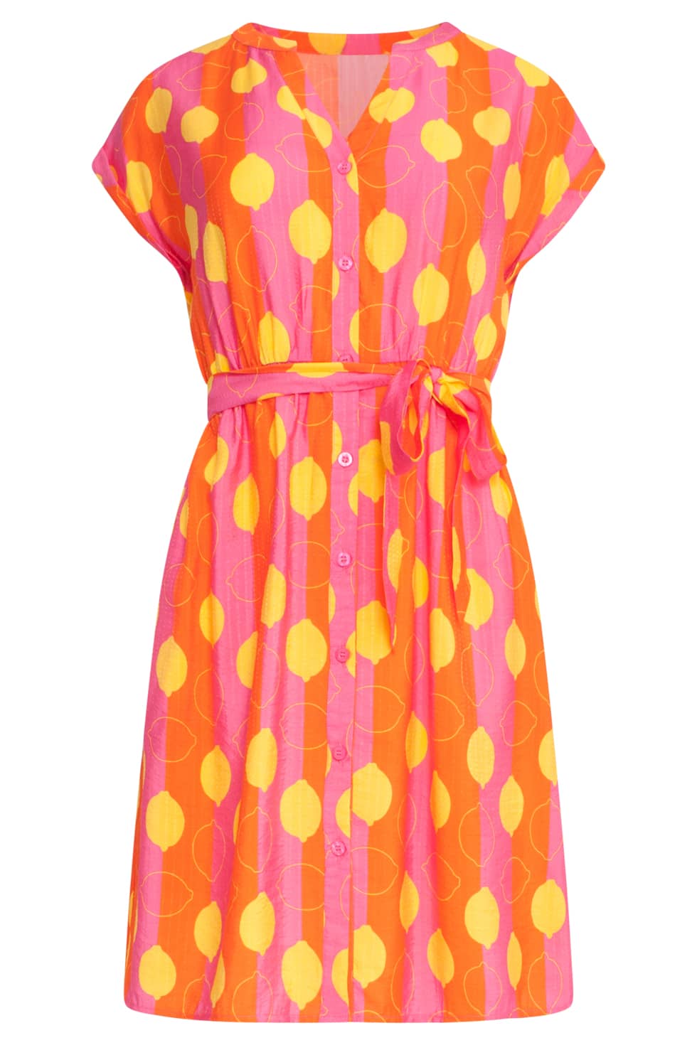 Jurk van Smashed Lemon in een citroenen dessin met korte mouwen, doorlopende knoopsluiting, V-hals en strikceintuur in de taille.