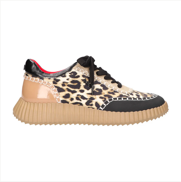 Sneaker van La Strada in een panter print met lakdetails, contrastrende stiksels, vetersluiting en een zoolhoogte van 3/4 cm.