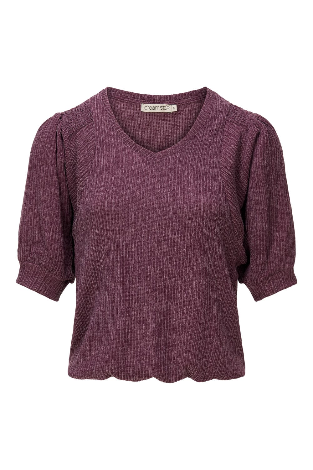 Shirt van Dreamstar in een structuurstof met korte pofmouwen, V-hals en een elastische zoom. Materiaal: Polyester 76%| viscose 20%| elastan 4%