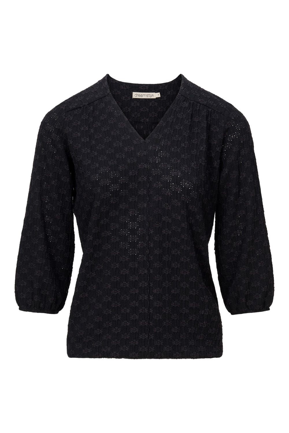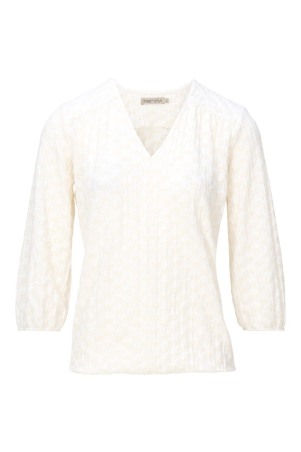 Broderie shirt van Dreamstar met driekwart mouwen, V-hals, plooien aan de schouders en een elastische zoom. Materiaal: Polyester 86%| katoen 13%| elastan 1%
