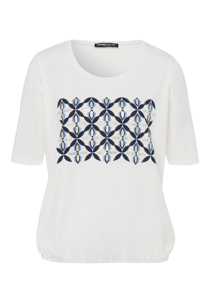 T-shirt van Frank Walder met korte mouwen, ronde hals, print aan de voorzijde en een elastische zoom. Materiaal: Katoen 45%| modal 45%| elastan 10%