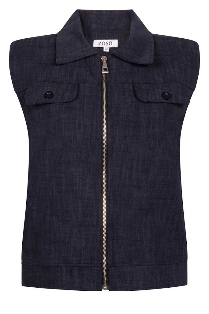 Mouwloos jacket van Zoso in een structuurstof met een ritssluiting, kraag en klepzakken op de borst. Materiaal: Viscose 63%| polyamide 31%| elastan 5%