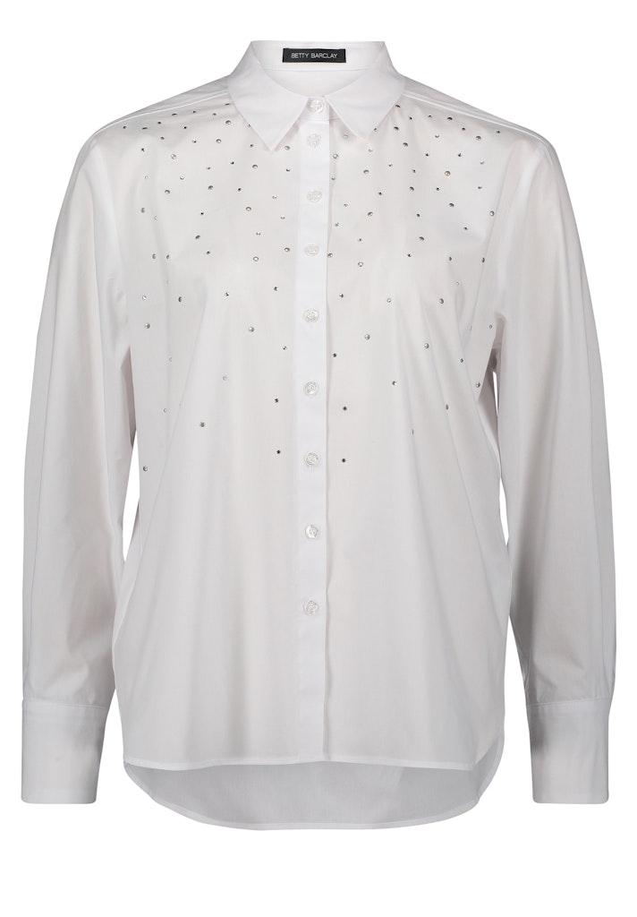 Blouse van Betty Barclay voorzien van strass-steentjes aan de bovenzijde, lange mouwen, kraag, knoopsluiting en een iets langere achterzijde.