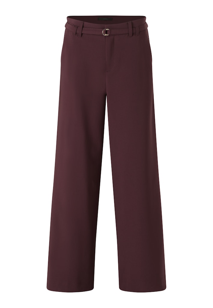 Broek van Angels met wijde pijpen, knoop- en ritssluiting, steekzakken, twee paspelzakken aan de achterzijde en een hoge tailleband voorzien van ceintuur.