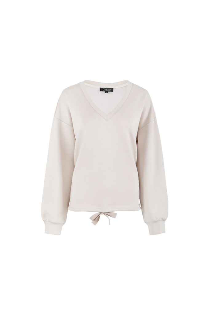 Sweater van G-maxx met lange mouwen, verlaagde schoudernaden, V-hals en strikdetail aan de onderkant. Materiaal: Polyester 57%| viscose 39%| elastan 4%