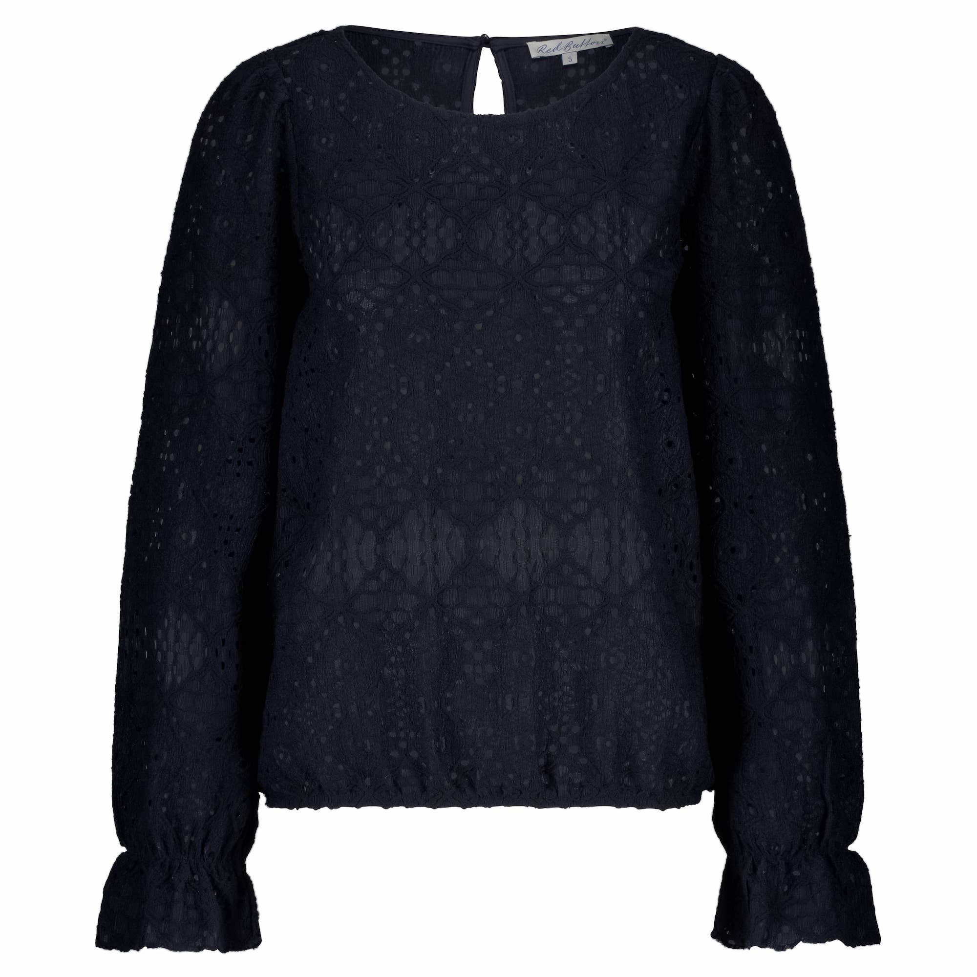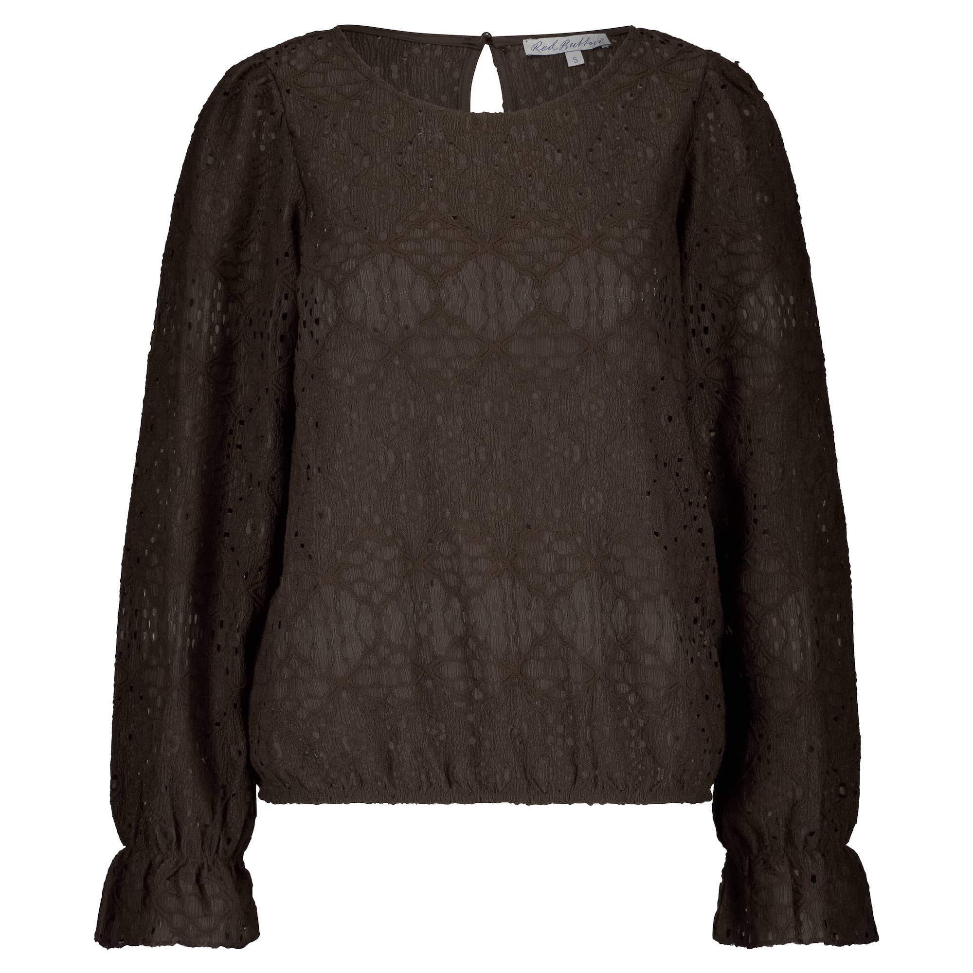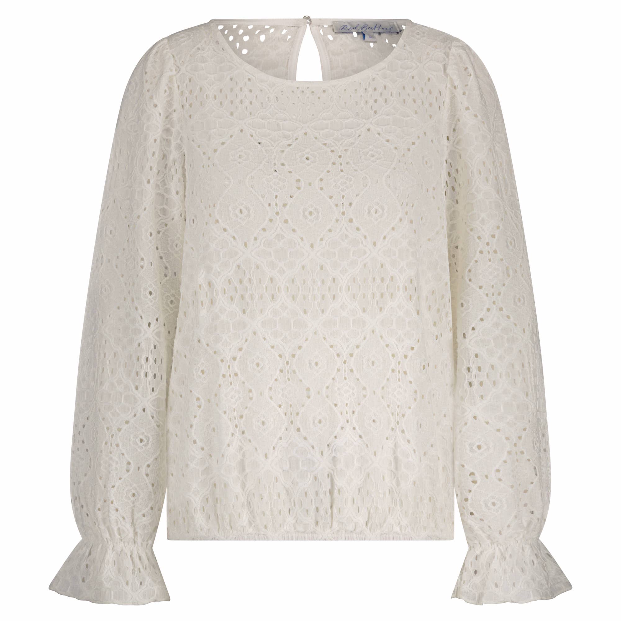 Ajour top van Red Button met lange pofmouwen voorzien van ruffels aan het eind, ronde hals, keyhole met knoopsluiting aan de achterzijde en een elastische zoom.