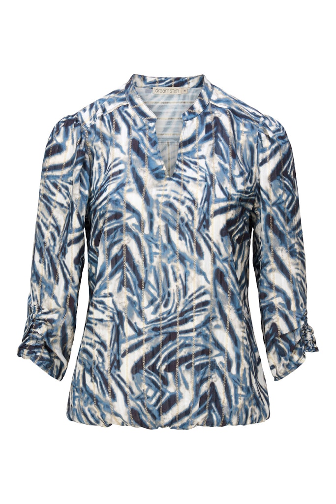 Blousetop van Dreamstar in een all-over dessin voorzien van lurex draad met driekwart pofmouwen, opstaande kraag voorzien van V-inkeping en een elastische zoom.