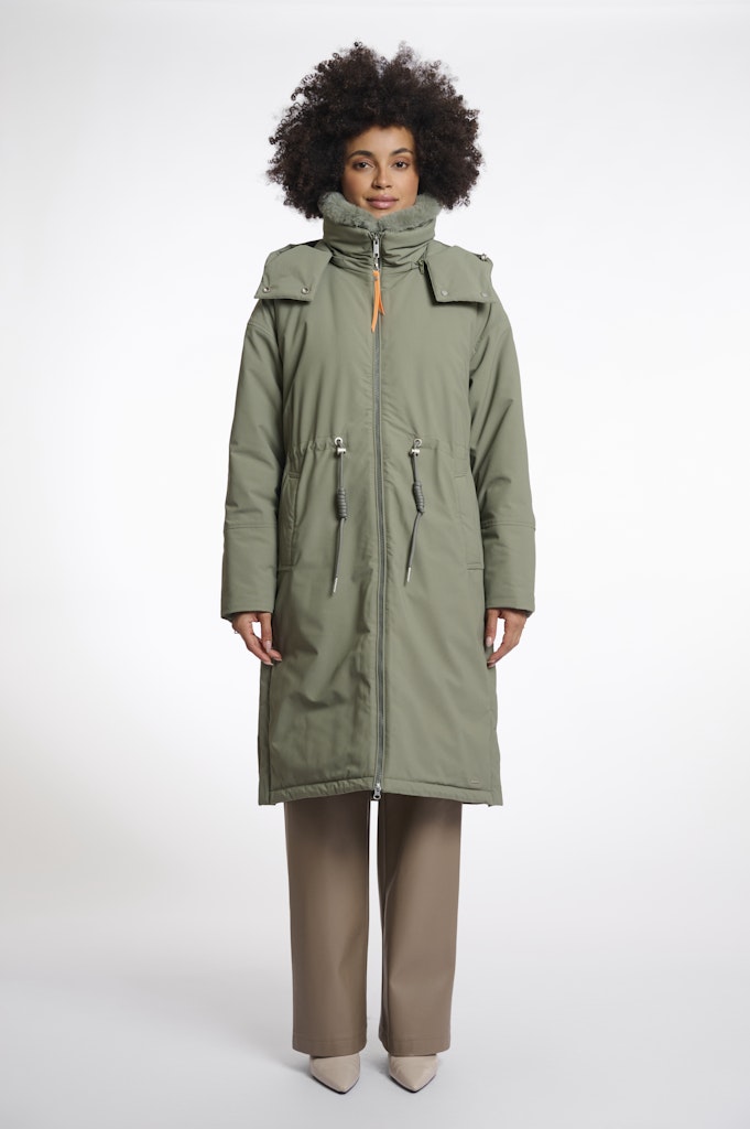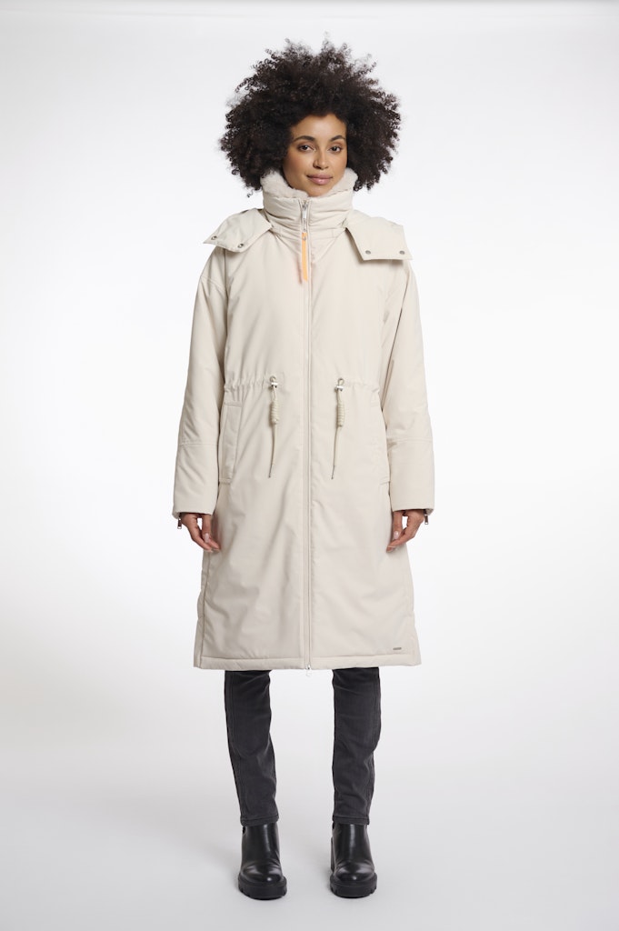 Jas van Rino & Pelle met een deelbare ritssluiting, rits bij de mouwuiteinden, afneembare capuchon voorzien van drukknopen, opstaande kraag met afneembaar imitatiebont, steekzakken, verstelbare taille en split met drukknopen aan de zijkanten.