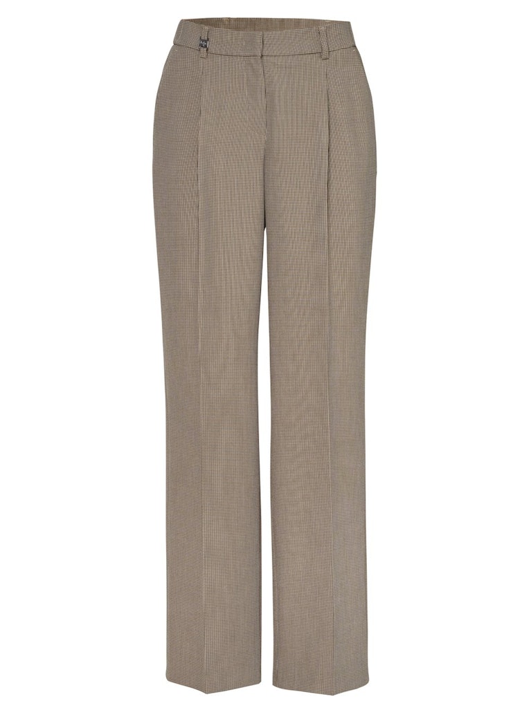 Broek van Toni in een subtiele structuur dessin met wijde pijpen, verborgen knoop- en ritssluiting, bandplooien, steekzakken en twee paspelzakken aan de achterzijde.