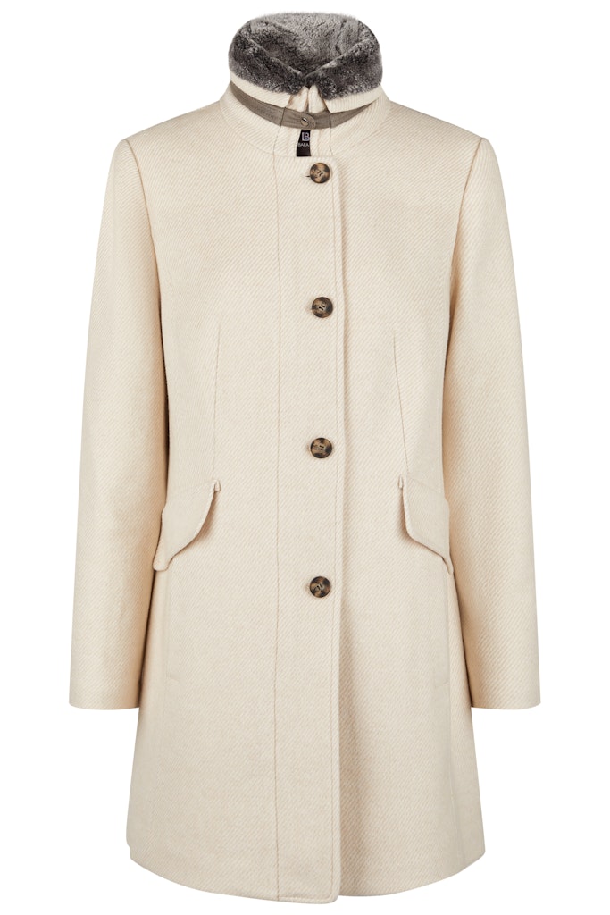 Getailleerde jas van Lebek in structuurstof met een knoopsluiting, opstaande kraag voorzien van imitatiebont en drukknoop en klepzakken. Materiaal: Polyester 70%| wol 30%