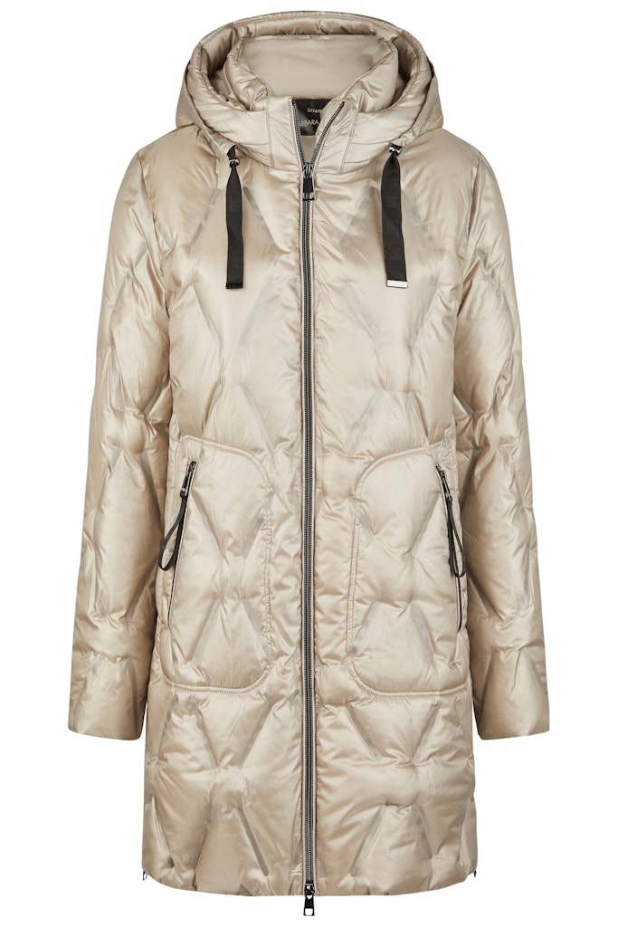 Gewatteerde jas van Lebek met een deelbare ritssluiting, opstaande kraag, capuchon voorzien van trekkoord en twee ritszakken.