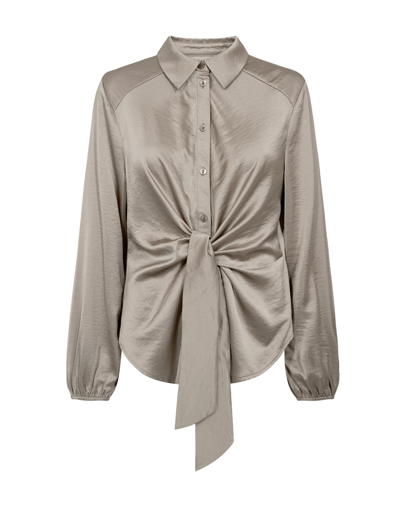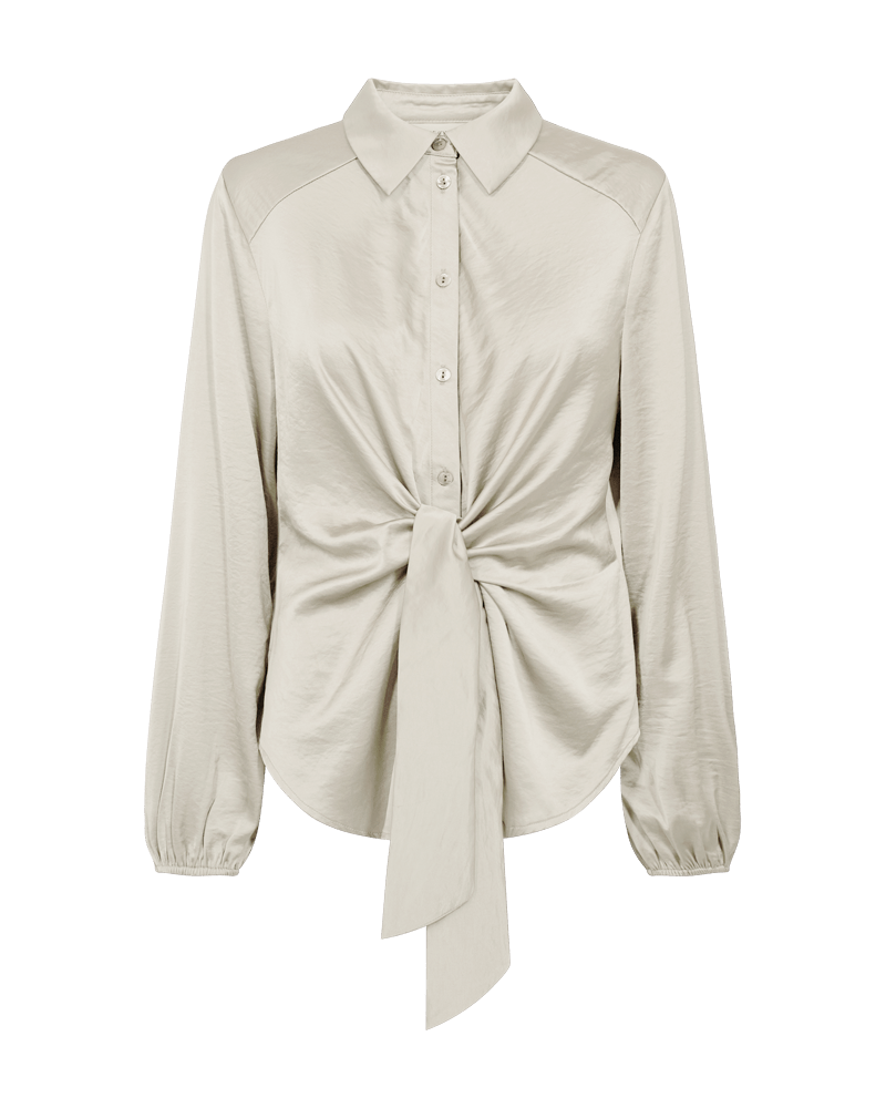 Satijnen blouse van Freequent met lange ballonmouwen, kraag, knoopsluiting en een knoopdetail aan de voorzijde. Materiaal: Polyester 54%| viscose 46%