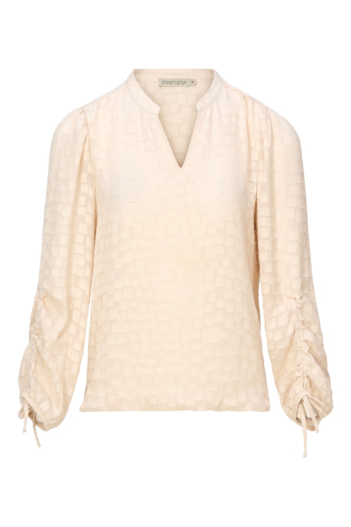 Blouse van Dreamstar in een all-over dessin met lange pofmouwen voorzien van een rimpeldetail aan de onderzijde, opstaande kraag en een V-hals.
