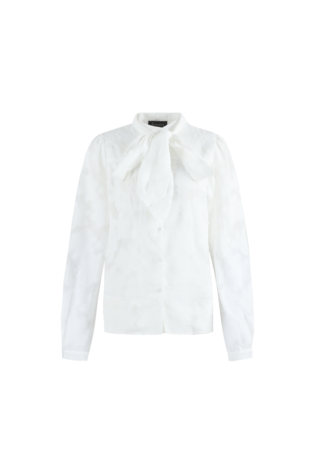 Blouse van G-maxx in een elegant geweven bloemmotief met lange pofmouwen, striksluiting aan de hals en een knoopsluiting. Materiaal: Polyester 100%