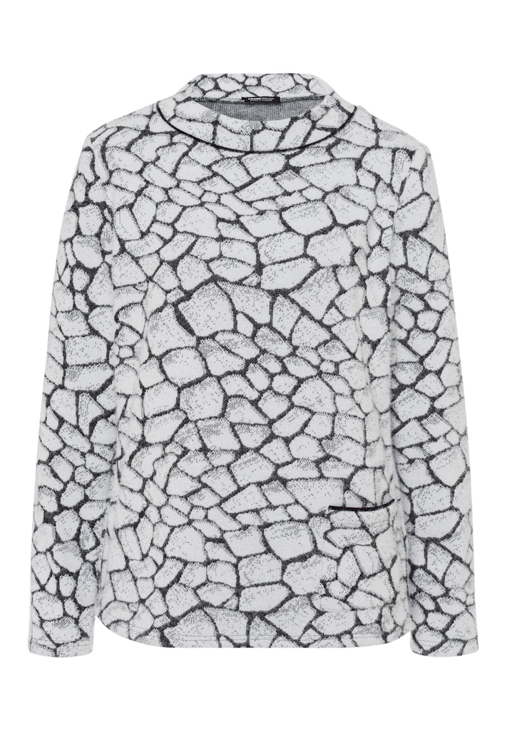 Trui van Frank Walder in een all-over dessin met lange mouwen, een paspelzak aan de zoom en een opstaande kraag.