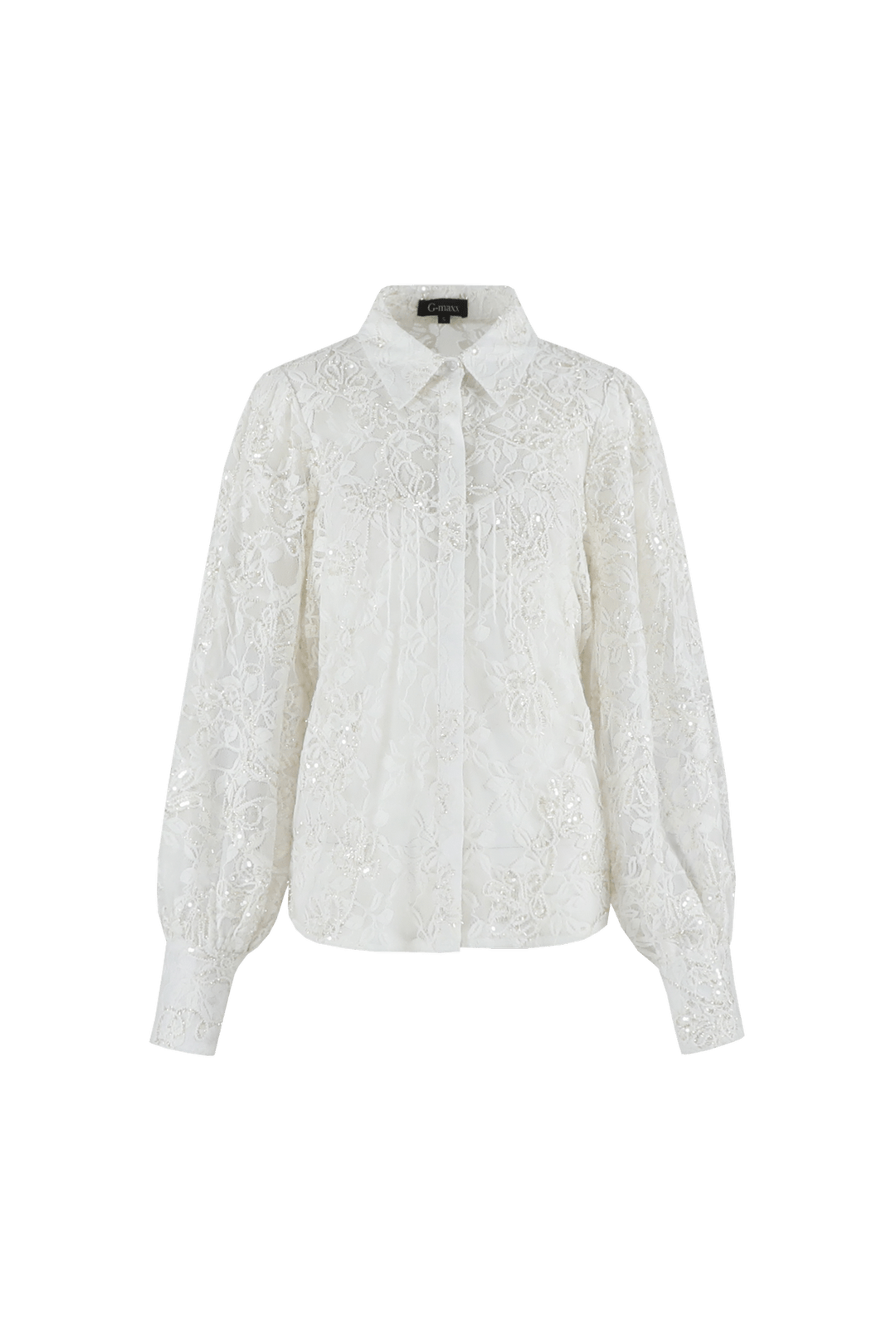 Kanten blouse van G-maxx voorzien van subtiele glansdetails met lange pofmouwen, kraag en een knoopsluiting. Materiaal: Polyamide 60%| polyester 40%