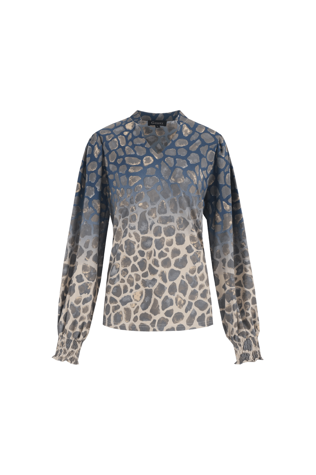 Blouse van G-maxx in een kleur verloop met een animal dessin, V-hals en lange pofmouwen voorzien van gesmokte manchetten. Materiaal: Polyamide 75%| elastan 25%