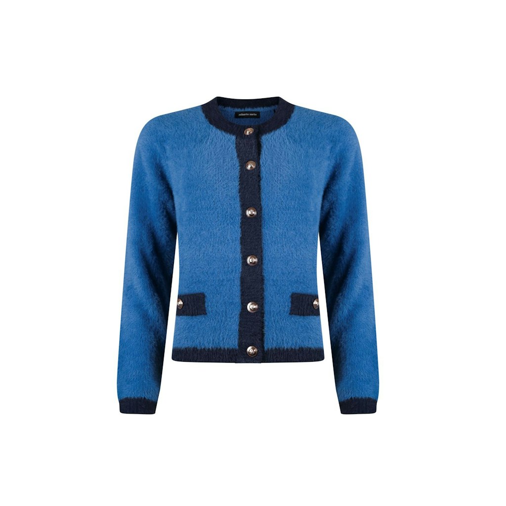 Zacht harig vest van Roberto Sarto met lange mouwen, ronde hals, knoopsluiting, contrasterende details en decoratieve zakjes.