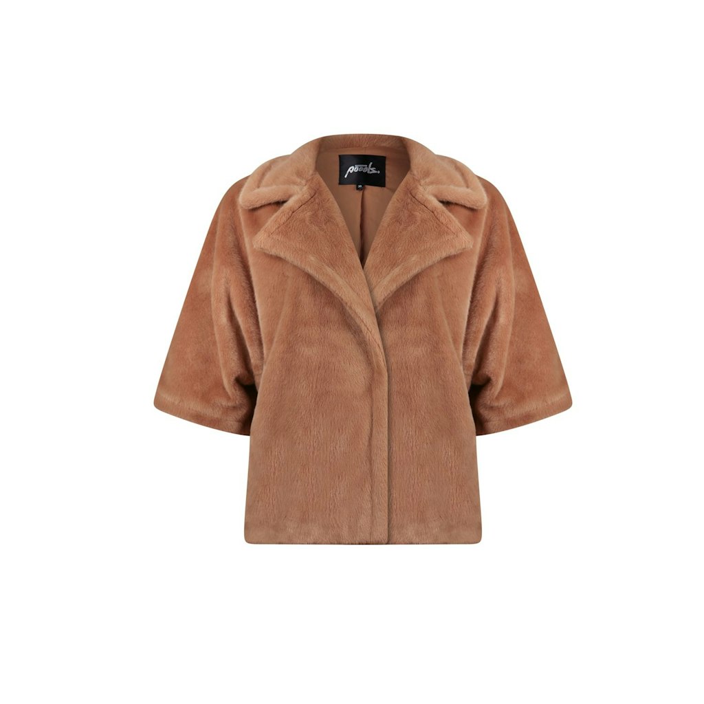 Faux fur jacket van Poools met driekwart mouwen, reverskraag en een verborgen drukknoopsluiting. Materiaal: Polyester 100%