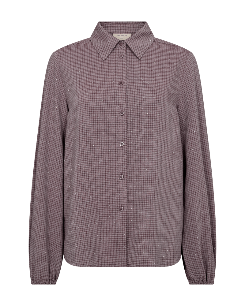 Blouse van Freequent in een subtiel dessin voorzien van strass-steentjes met lange pofmouwen, kraag en een knoopsluiting. Materiaal: Viscose 51%| polyester 49%