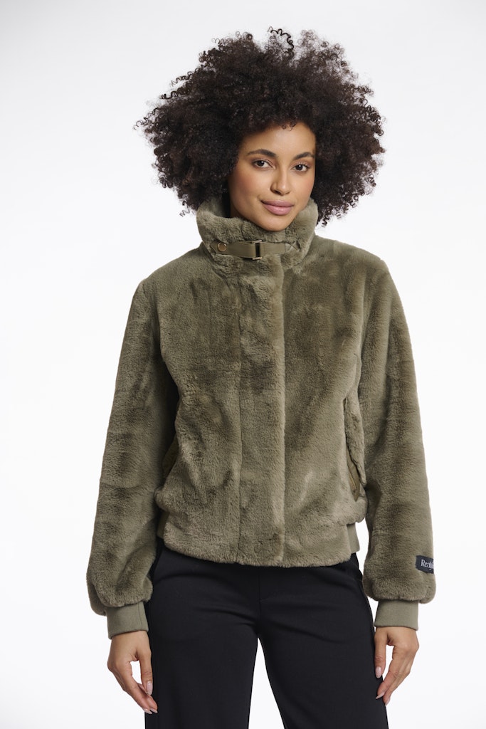 Fake fur jack van Rino & Pelle in een animal dessin met een verborgen ritssluiting, opstaande kraag voorzien van gesp, ritszakken en elastische boorden.