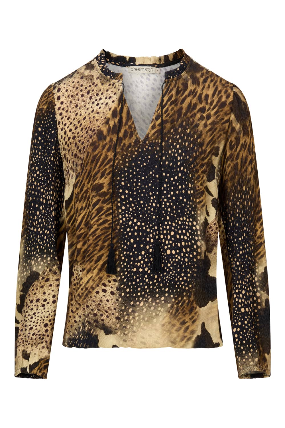 Blouse van Dreamstar in een all-over dessin met lange mouwen, opstaande kraag en een V-hals voorzien van strikkoordje met kwastjes. Materiaal: Viscose 100%