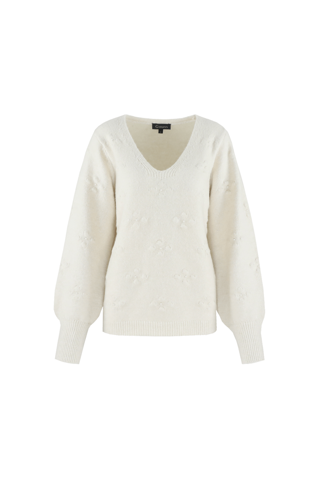Trui van G-maxx met ingebreide details voorzien van parels, lange mouwen, V-hals en ribgebreide boorden. Materiaal: Polyester 55%| acryl 30%| wol 5%