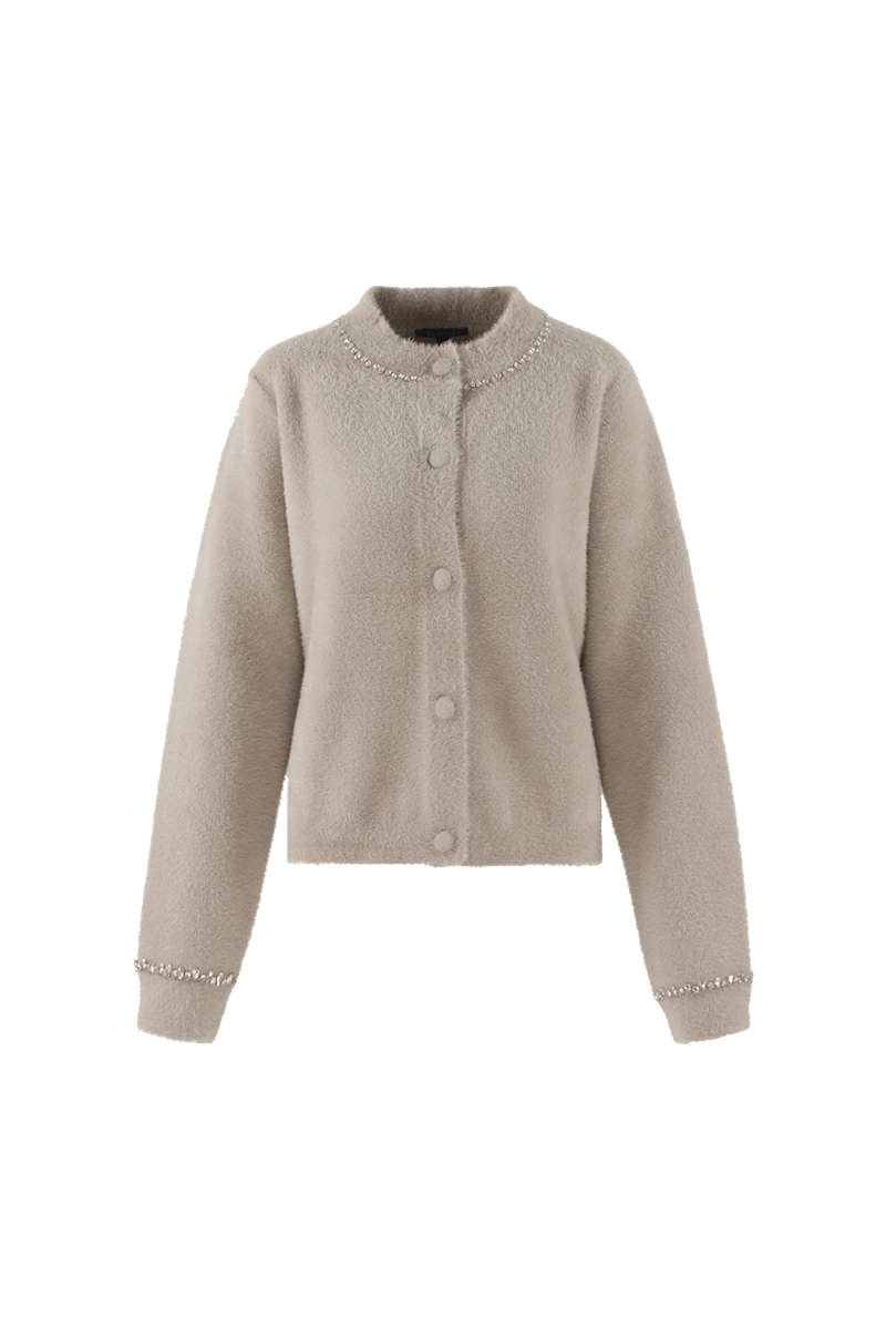 Zacht vest van G-maxx met lange mouwen, ronde hals, knoopsluiting en siersteentjes langs de hals en mouwuiteinden.