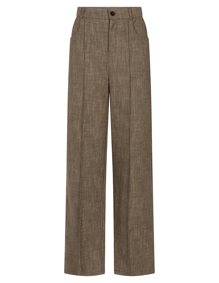 Broek van ZOSO in een all-over dessin met wijde pijpen, gestikte vouwnaad aan de voorzijde, knoop- en ritssluiting, steekzakken en opgestikte achterzakken. Materiaal: Viscose 63%| polyester 31%| elastan 5%