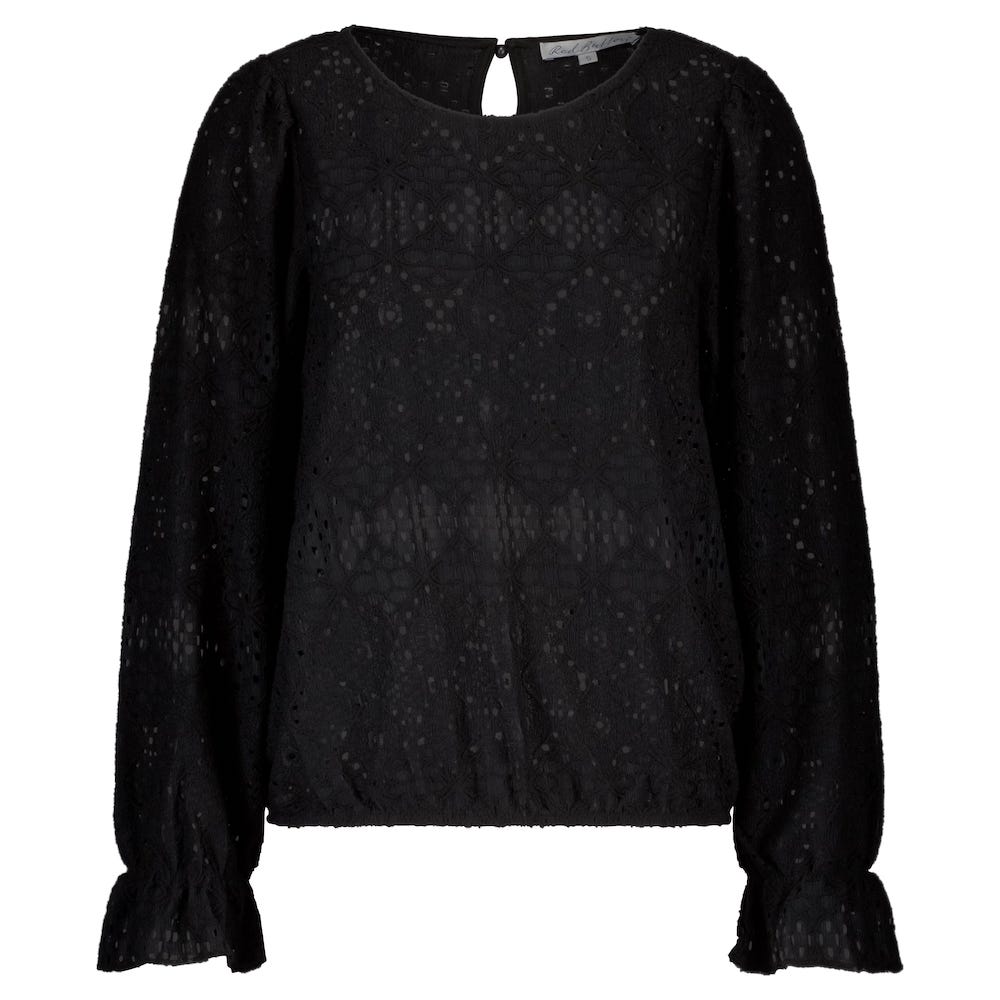 Ajour top van Red Button met lange pofmouwen voorzien van ruffels aan het einde, ronde hals, keyhole met knoopsluiting aan de achterzijde en een elastische zoom.