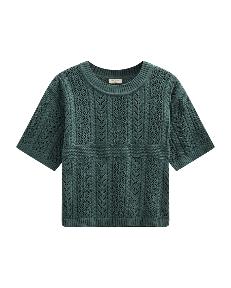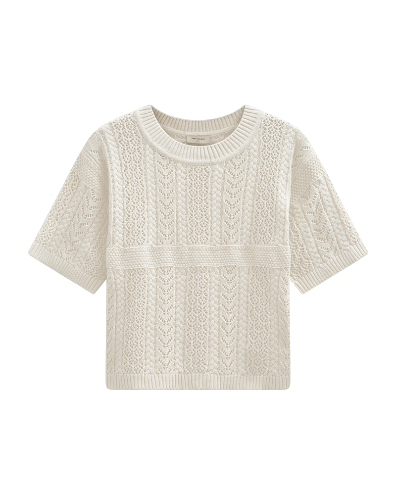 Zacht gebreide trui van Freequent in verschillende patronen met korte mouwen, ronde hals en ribgebreide boorden. Materiaal: Biologisch katoen 100%