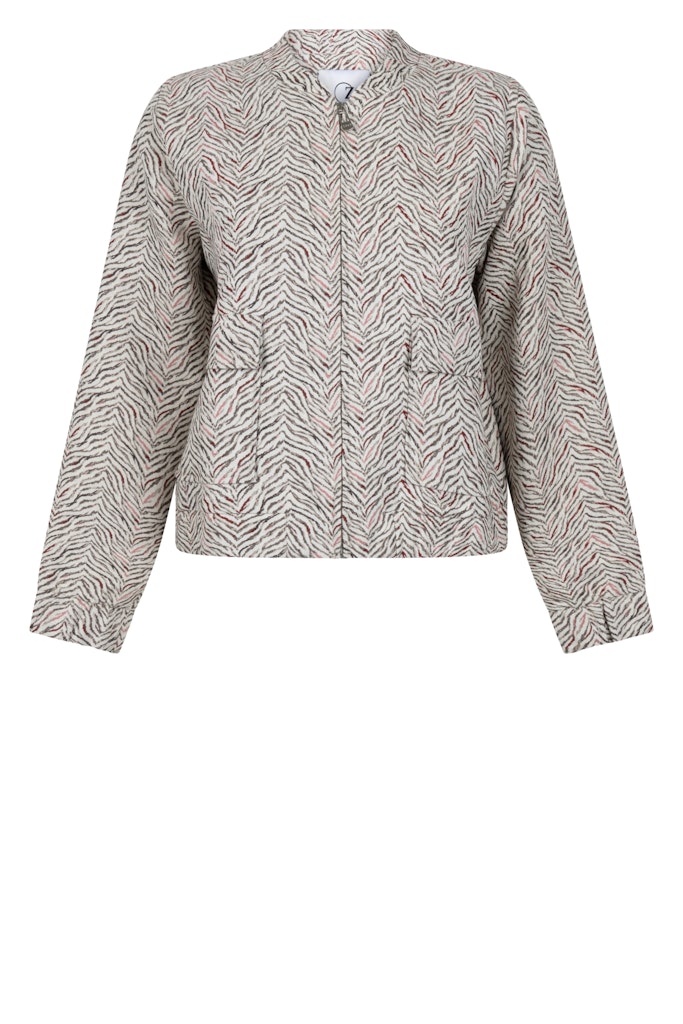 Jacket van Zoso in een all-over dessin met lange mouwen, opstaande kraag, ritssluiting en twee opgestikte klepzakken. Materiaal: Polyester 76%| viscose 22%| elastan 2%