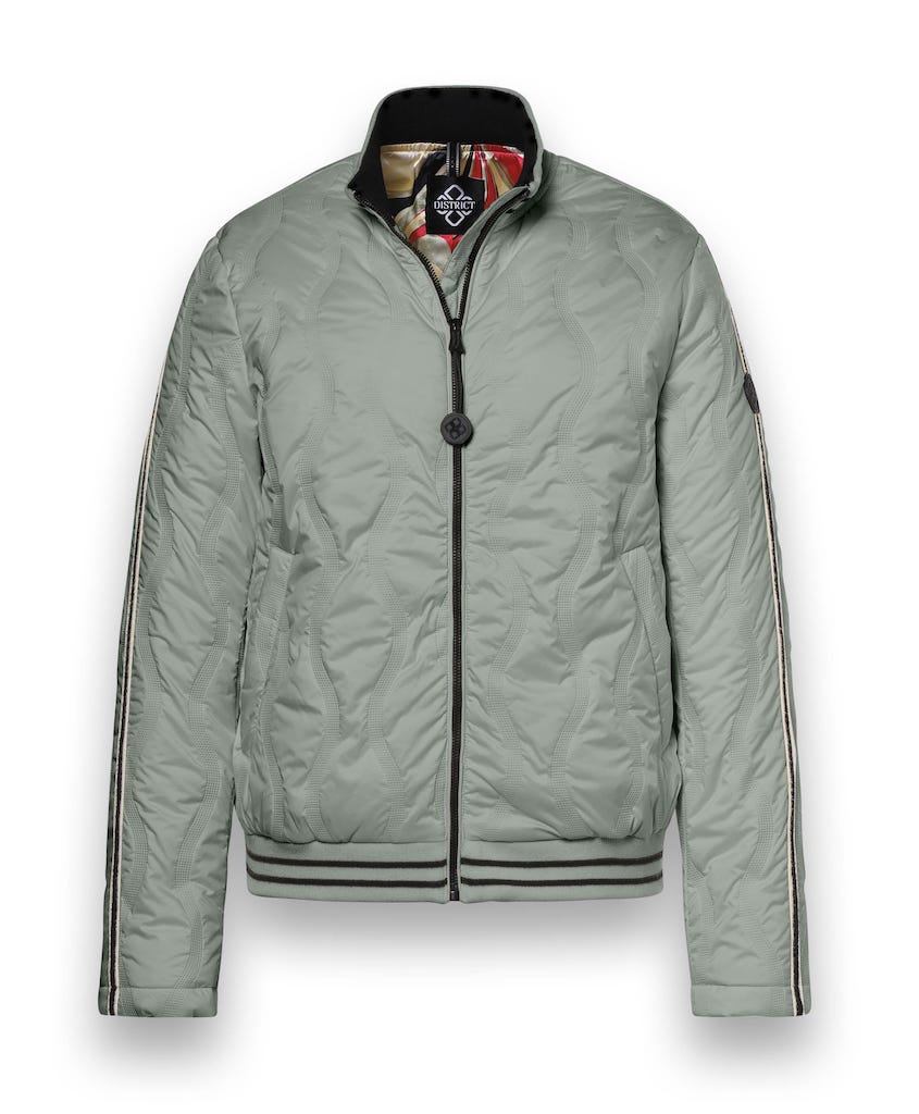 Gewatteerd bomberjack van District met een ritssluiting, opstaande kraag, steekzakken, contrasterende bies langs de mouwen en gestreepte ribgebreide boorden.
