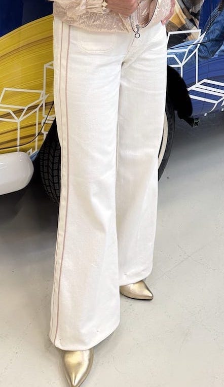 Broek van Parami met wijde pijpen voorzien van contrasterende bies aan de zijkanten, knoop- en ritssluiting en opgestikte zakken aan de voor- en achterzijde.