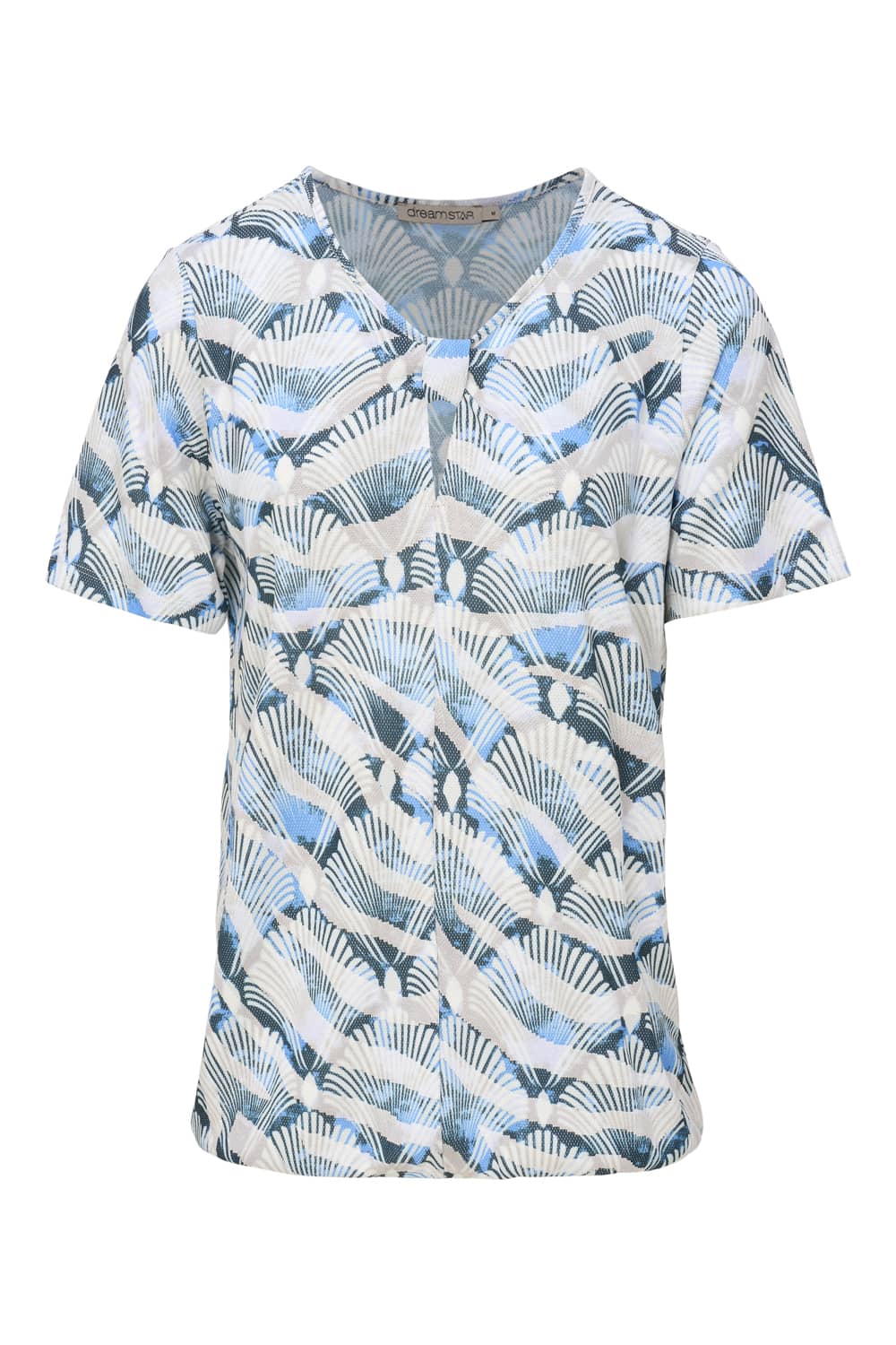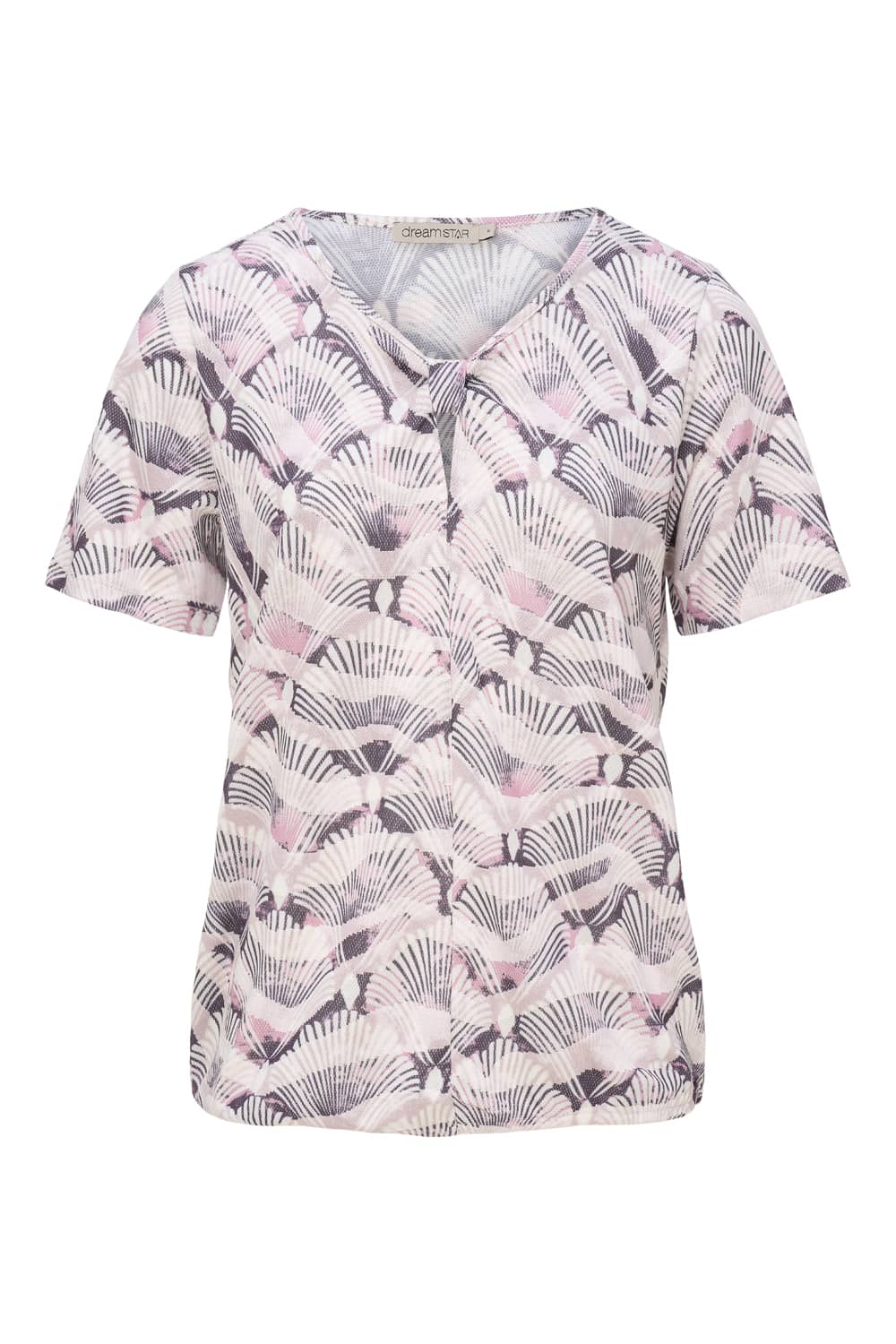 Top van Dreamstar in een all-over dessin met korte mouwen, elastische zoom en V-hals voorzien van cut-out detail. Materiaal: Viscose 70%| polyester 30%